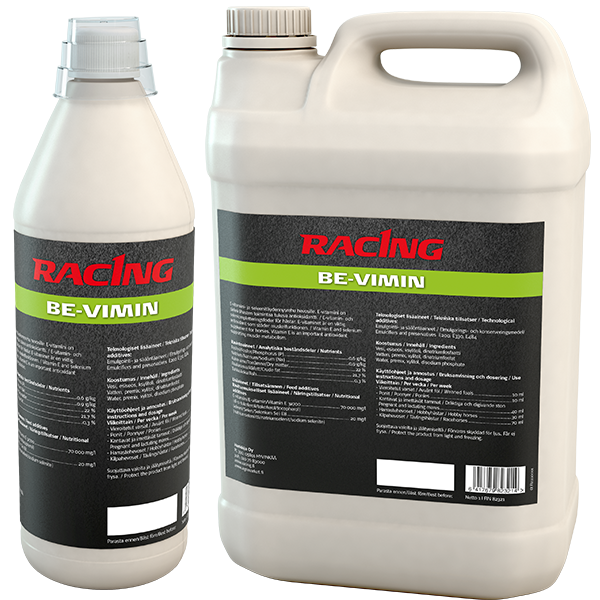 Racing BE-Vimin on monipuolinen ja tehokas B- ryhmän vitamiineja ja E-vitamiinia sisältävä vitamiiniliuos.