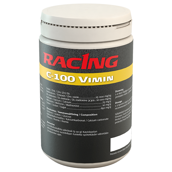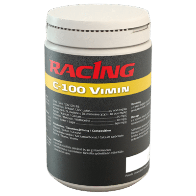Racing C-100 Vimin on tarkoitettu kaikkien hevosten vitamiinihuoltoon. C-vitamiini vaikuttaa mm. veriarvoihin (raudan imeytymiseen) ja siten hapen aineenvaihduntaan.