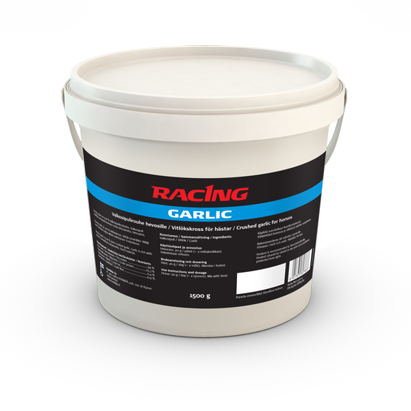 Racing Garlic on rouhittua valkosipulia, joka on 100 % puhdas luonnontuote. Racing Garlic ei sisällä mitään lisäaineita, joten se on turvallinen lisä hevosen ruokintaan muun muassa stressitilanteissa, jolloin vastustuskyky saattaa olla heikentynyt. Valkosipuli sisältää runsaasti luonnon omia tehoaineita ja auttaa hevosta ylläpitämään hyvää vastustuskykyä. Valkosipuli auttaa myös hevosen hengityselimistöä pysymään terveenä ja säilyttämään normaalin toimintansa.