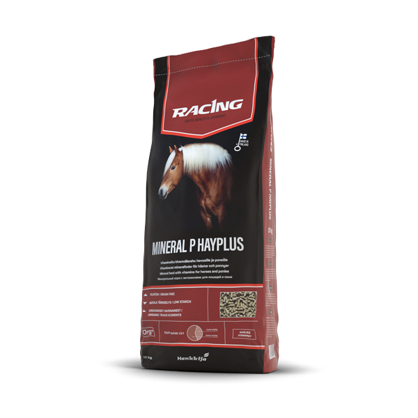 Racing Mineral P HayPlus on fosforipitoinen rakeistettu kivennäisrehu, joka tasapainottaa kivennäisten, hivenaineiden ja vitamiinien saannin korsirehupainotteisessa ruokinnassa. Tuotteen kalsium-fosfori-suhde on 1,5:1. Soveltuu erinomaisesti täydentämään kivennäisten saantia, kun täysrehun käyttömäärä on suosituksia pienempi. Sopii myös hyvin ruokintaan, jossa käytetään korsirehun lisäksi lähinnä melassileikettä, viherjauho- tai sinimailaspellettiä. Mikäli ruokintalaskelmien pohjalta ruokintaan tarvitaan lisää fosforia on Mineral P HayPlus hyvä vaihtoehto kivennäiseksi.
