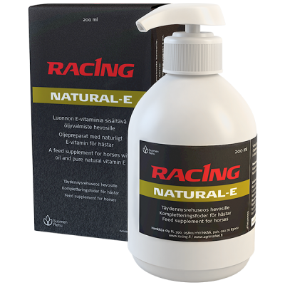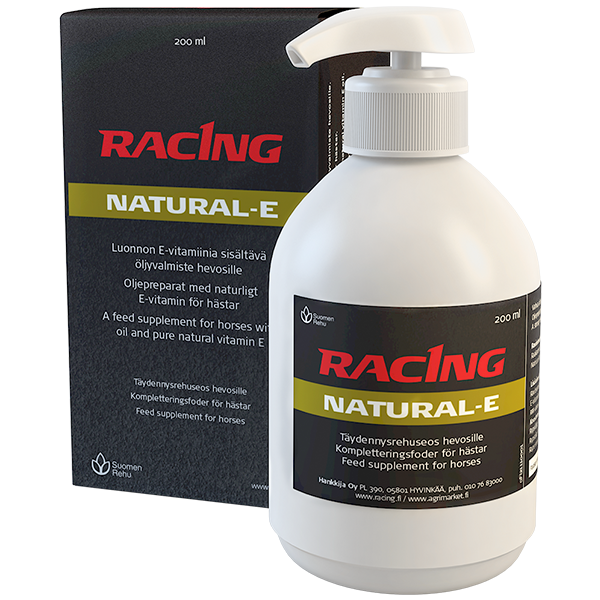 Racing Natural-E on vahva luonnon E-vitamiinia sisältävä öljyvalmiste. Tutkimusten mukaan luonnon E-vitamiinin imeytyvyys on selkeästi tehokkaampaa kuin synteettisen E-vitamiinin. Tuote on erittäin riittoisa, sillä annostelu on huomattavasti synteettistä E-vitamiinia pienempi. 2 ml Racing Natural-E-valmistetta vastaa 500 mg E-vitamiinia.