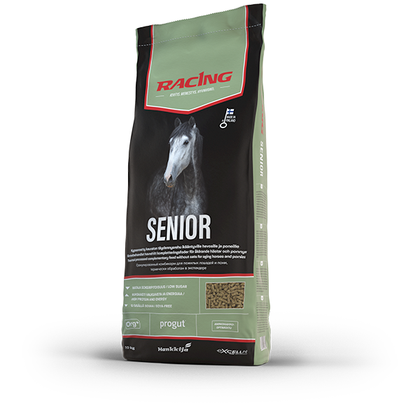 Racing Senior sisältää laadukkaita, tarkasti valikoituja ja hyvin sulavia raaka-aineita. Koostumuksessa on huomioitu yli 15 vuotiaiden ja vanhempien hevosten tarpeet suomalaisissa olosuhteissa. Hyvä energia-arvo ja optimoitu valkuaisen koostumus ylläpitävät lihasmassaa. Senior sopii myös urheilu- ja siitoshevosten ruokintaan. Senior on kauraton täysrehu. Expander-valmennuksella huolellisesti esikypsennetyn rehun sulavuus on erittäin hyvä ja ravintoaineet imeytyvät tehokkaasti.